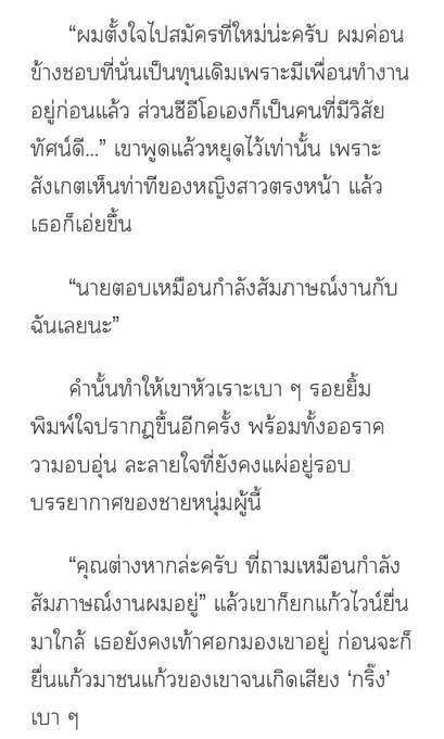 คุยกันยังไงให้เหมือนมาสัมภาษณ์งานคะเนี่ยแล้วประเด็นสถานที่แบบนี้มันไม่ใช่ที่สำหรับสัมภาษณ์งานนะแต่ถ้าเป็นสัมภาษณ์สามีในอนาคตก็โออยู่🤭 พระนางมีความพูดคุยกันได้อย่างไหลลื่นคนนึงมีตัวตนเป็นถึงบอสบริษัทใหญ่แหละส่วนอีกคนก็ให้ฟีลพนักงาน~