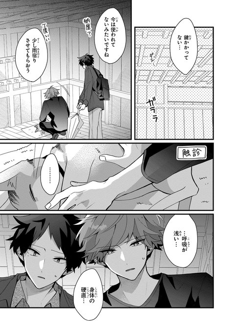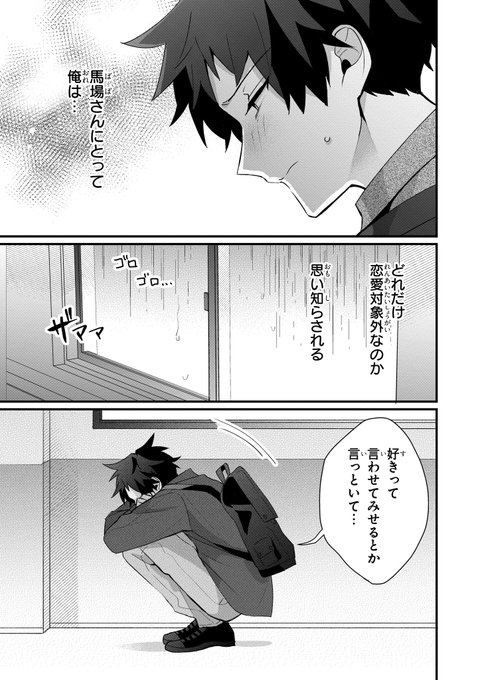 大雨から身を守るため、ふたりきりで雨宿りをする鷹羽と馬場。