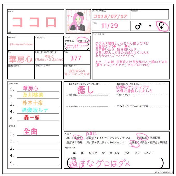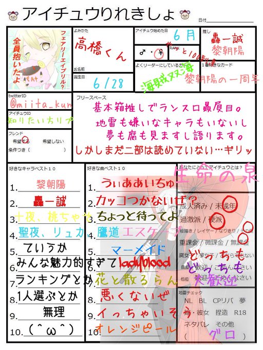 新しい年になりましたので履歴書の更新しました!アイチュウ以外のことも呟いたり、自己満足でイラストなんかも描いたりしていますが仲良くして頂ければと思います。気になった方お迎えさせて頂きます。 #アイチュウクラスタさんと繋がりたい #アイチュウ履歴書