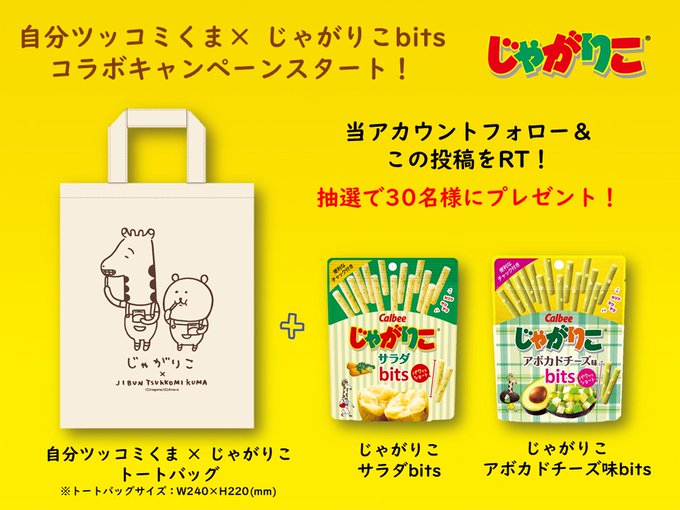 当アカウントフォロー&この投稿をRTした方の中から抽選で30名様にオリジナルトートバッグとじゃがりこbitsをプレゼントします!〆切は8月30日23:59まで!