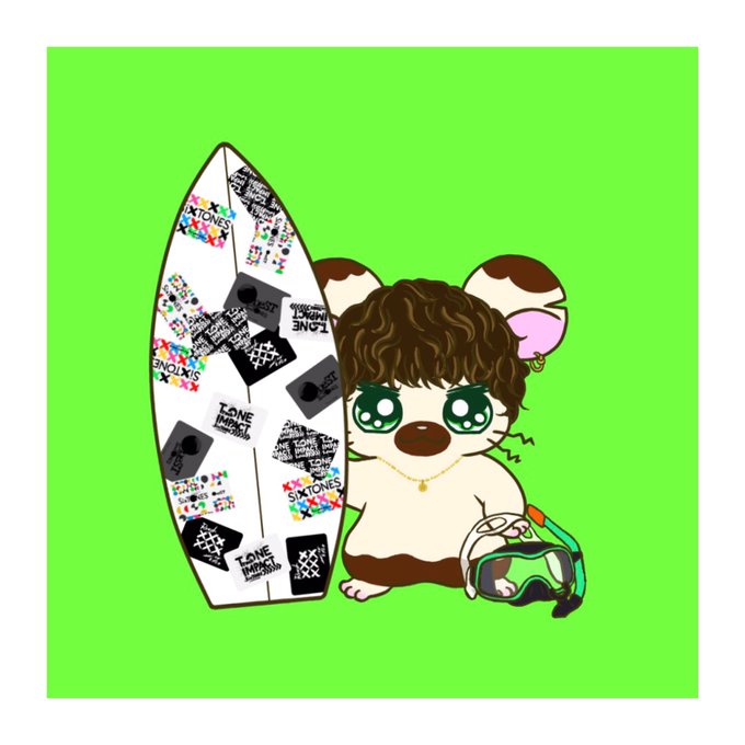 またまたn番煎じ否めないハムちゃんずシリーズ🐹タイショーくんリスペクトなたろハム💚ふわふわパーマ難しい…似てないのはいつものことなので…許して…サーフボードのステッカーは全部手描きした☺️シュノーケルも頑張った☺️変なところ描き込むのほんと自分バカ☺️(ネックレス忘れたので再掲)