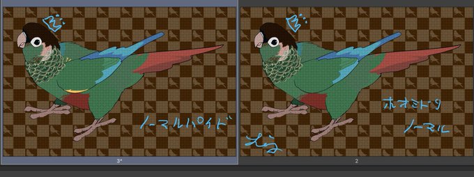 そしてマニアックにもほどがあるだろうと言う、ノーマルとノーマルのパイドを描いてみました。少しだけ黄色い石が羽に混じってくるんですよね。緑色遺伝子が退色して。