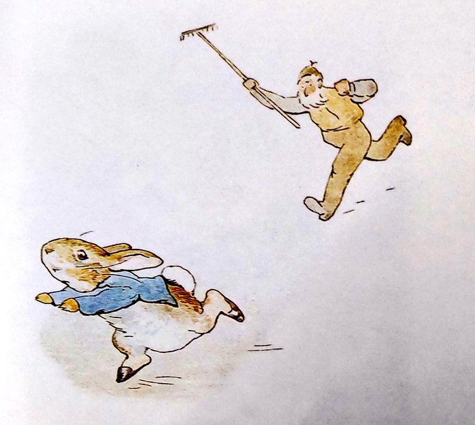 ピーターラビットの絵本を出しました。始まってすぐお母さんが「おまえたちのお父さんは畑で事故にあい肉のパイにされてしまったよ」でムム…となり、その直後の何をも恐れぬピーターが畑に行っちゃう流れは絵が最高で笑っちゃう。トムとジェリーみたい。