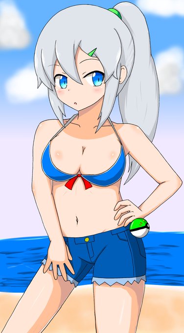 #ユーリム脳内スクショ祭り #ユーリム地方 円卓会議の後の海行くって話で ユキの水着姿 普通に泳げるし何時でもバトルできるように腰にボールを着けてる