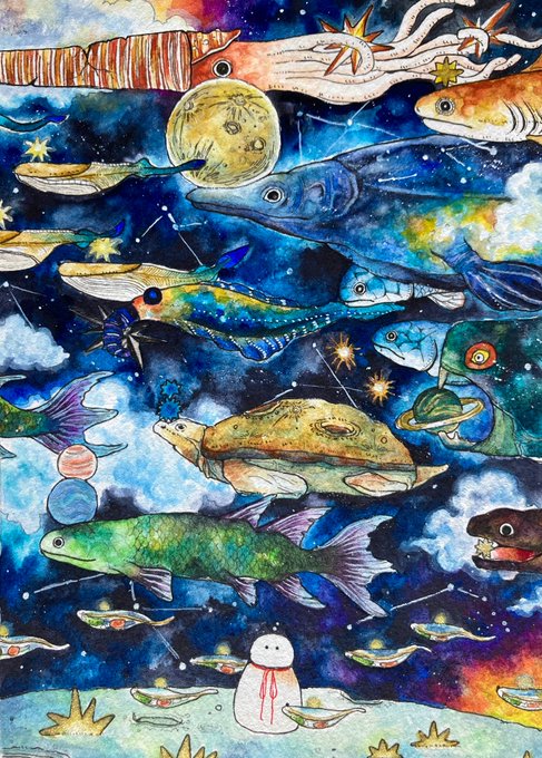 →不思議な世界で海神さまがただゆったりのんびり旅しているだけの一枚絵です。