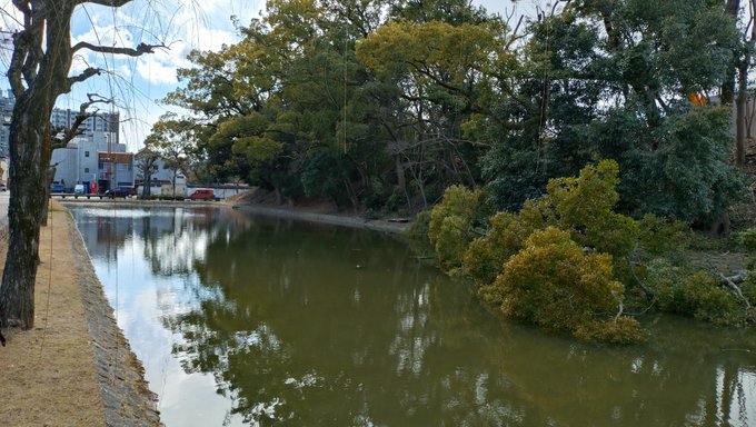 ①②③内京口門跡。内部は学校の敷地となっているため入ることはできない。一の門脇の巨大な立石が目立つ。土橋が駐車場として使われているのは珍しいと思う。④後世の埋め立てにより、このあたりで水堀は途切れる。
