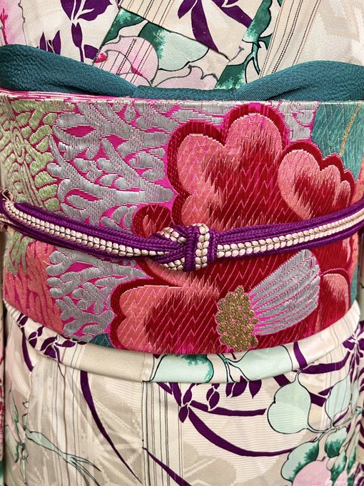 薔薇や牡丹模様の単衣のお着物に、椿模様の名古屋帯を合わせました。
