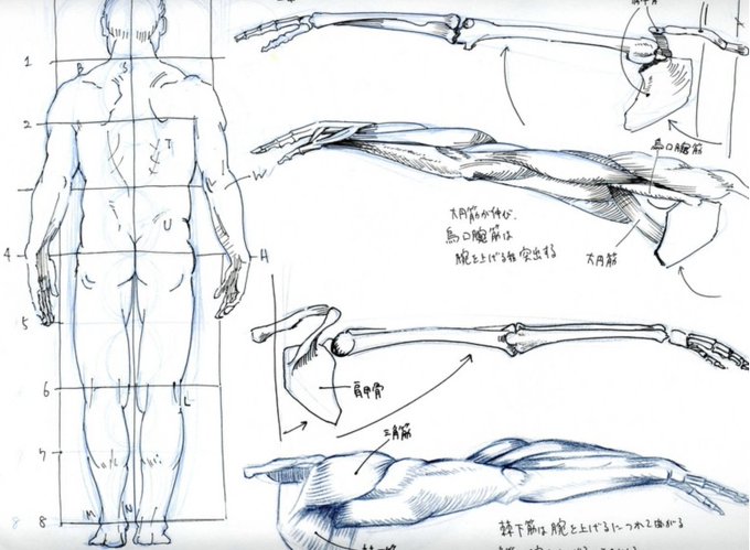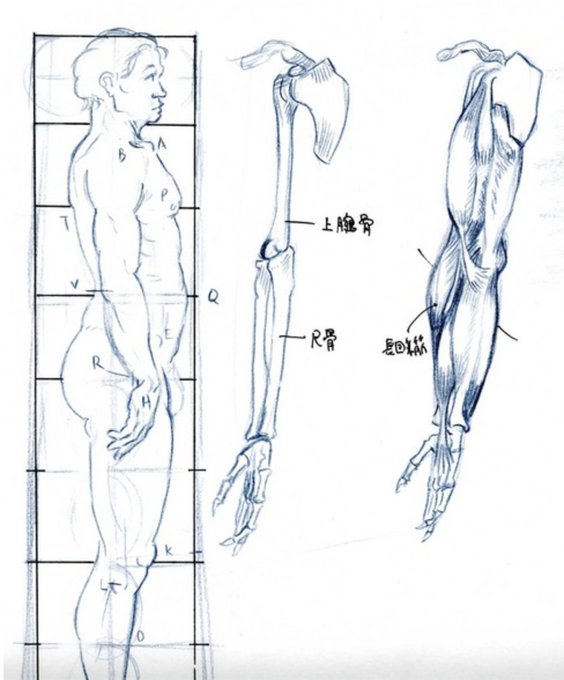 3Dのスケルトンボディや人体筋肉を参考に筋肉色分けして勉強しながら描いてます