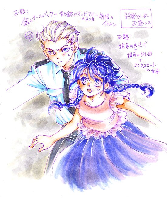 診断メーカーのお題で描いたイラストが溜まったのでまとめ。お題の内容はイラストの中の手書きメモを見てもらえれば把握できるかと。大体落書きレベルで雑な仕上がりとなっておりまする。あと最新のやつはスキャンついでにちょっと加筆した←