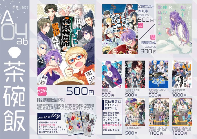 8/28 閃華の刻37 A-04ab【茶碗飯】のおしながきです 夏コミとほぼ同じですが長髪歌仙本再版したので持っていきます~ 新しいものは軽装若旦那本(https://t.co/sHFl3NiILR)と兼定と文久土佐組のアイスアクキー(https://t.co/1PsbJsHob0)です 4枚目は当日ポスターです よろしくおねがいします