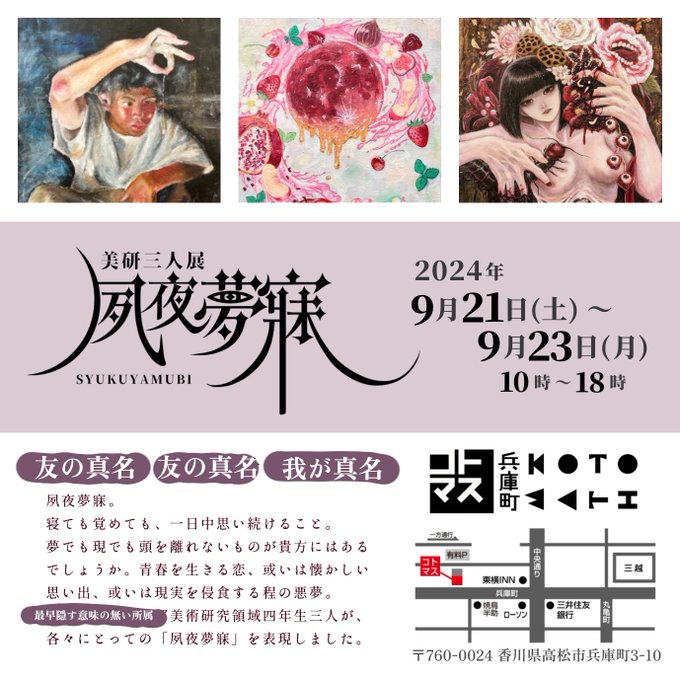 9/21(土)〜23(日)で香川県高松市コトマスさんで油絵作品中心の三人展をします。入場無料!物販やドリンク販売等あるので多分ずっと店番してます。
