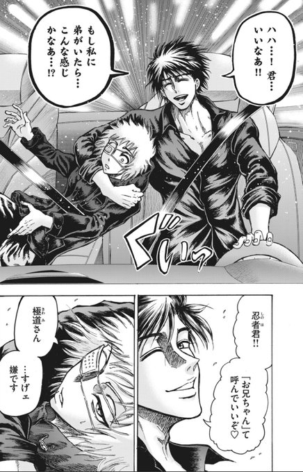 忍者と極道、毎週まじめに読み始めたのがかなり最近だった為に極道さんのキャラをいまいち把握できてなくて、こことか「スゲーヤバい人に見えるけどきっと全部読んでるといいシーンなんだろうなあ」って思ってたんですけど、今回の一気読みで全部読んだ感想としては「こいつヤベーな……」です。