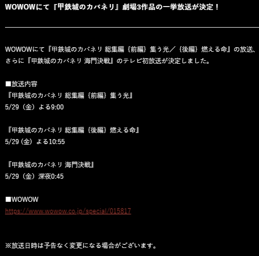 明後日5月29日夜9時からWOWOWにて『甲鉄城のカバネリ 総集編 前編 集う光/後編 燃える命』と『甲鉄城のカバネリ 海門決戦』がWOWOWにて放送。海門決戦はTV初放送