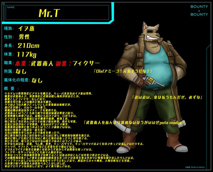 無所属、キューバ系イヌ族のMr.tです!よろしくお願いいたします!2枚目は横顔、3枚目はサングラスの軽い性能説明です!プロフィール画像のイラストはR4さん(@R461419502)が描いてくださったものを使用させていただいております!本当にありがとうございます!