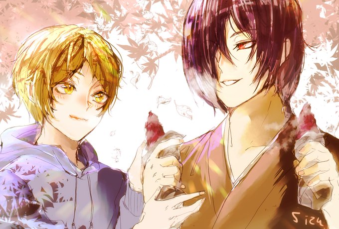 秋。自宅近くによく来る石焼き芋屋台を「トラップ」と呼んでいるピンク。今日もかかったんだなと、半分こされた焼き芋をもらって笑うユーリ。