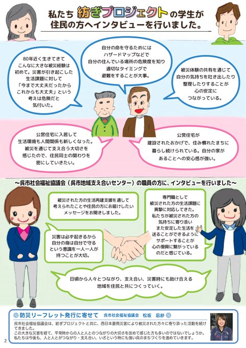 今日で #東日本大震災 から11年。改めて #防災 #減災 #復興支援 について見つめ直すきっかけとして、紡ぎプロジェクトの学生が呉市社会福祉協議会と共同で作成した防災リーフレットをご紹介。避難時に役に立つ情報を学生目線でお届けします。