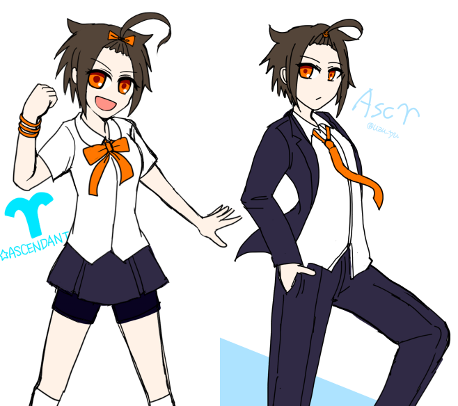東紗&環(♈ASC⇔♎太陽金星DSC)の第一衣装と第二衣装を並べた。 この高校は男女制服どっち着てもいいので二人とも気分で変えてくる。 #宙兎ホロ擬