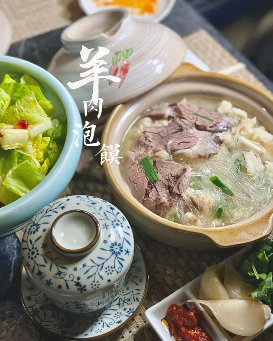 #ようこそ_陝西省へ 羊(牛)肉泡馍は西安市で有名な軽食として人々に親しまれています。上等な牛肉あるいは羊肉に香辛料を加え、鍋で煮込んでできたシチューの中に、小さくちぎった焼きパンを入れた料理です。ニンニクの砂糖漬けを一緒に食べると味はより一層よくなります。 #文化 #生活 #写真 #歴史