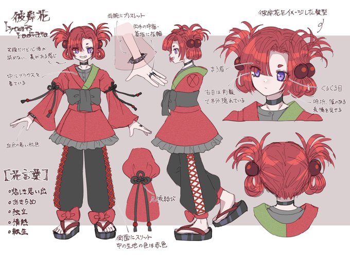 彼岸花を擬人化した少女です。毒を持ち孤独でしたが、そんな中で1人だけ心を許したひとがいます。明るそうな表情を見せることもありますが、悲しい過去を持つ女の子です🌺