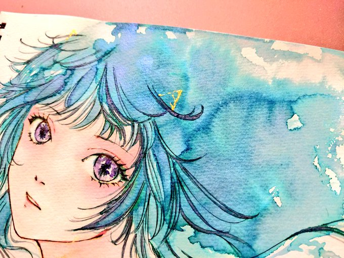 温度と湿度で色が変わるインク使って描いてるんですがめちゃくちゃ綺麗だし水色と紫の遊色が楽しい