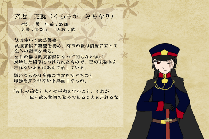 武装警察の制服デザインと武装警察の総監を務める公式NPC:玄近充就(くろちかみちなり)のキャラクターシートです。