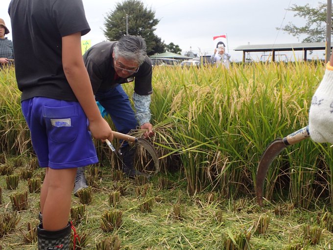 稲刈りは、ノコギリ鎌を使います。刃がノコギリのようにギザギザになっています。草刈り鎌のように振り下ろすのではなく、イネを左手でにぎり、右手は鎌をもって刃を株にあてて引っぱるようにして切ります。