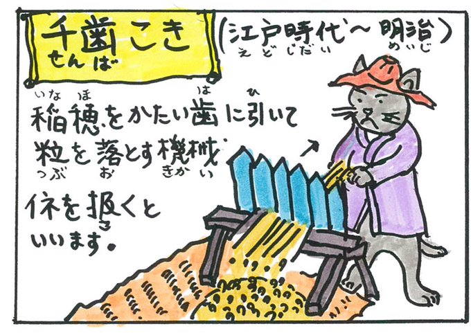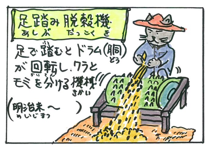 むかしは、十分に乾燥した稲は、田んぼの一か所に集めて、そこで穂の先から籾だけ分ける作業、脱穀(だっこく)または稲扱(こき)をしました。籾(もみ)をとったあとの稲が稲わら、または単に「わら」といいます。