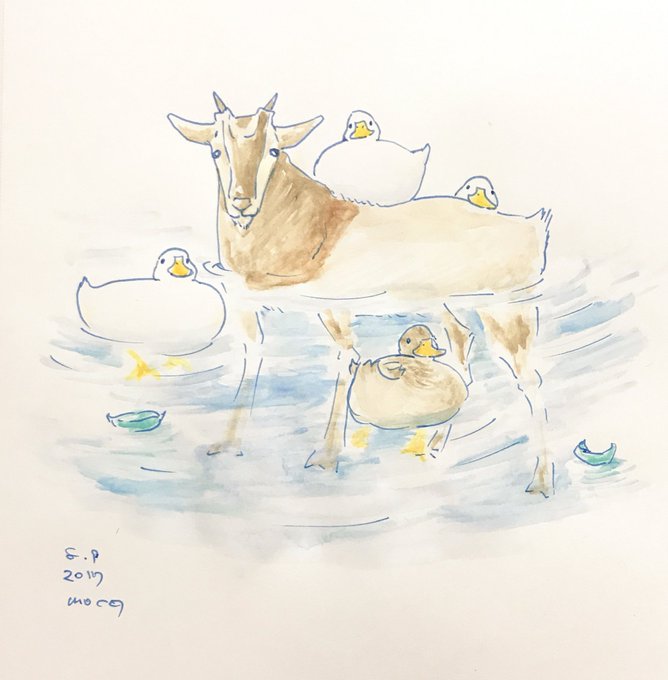 8/9 水浴び中のヤギ発見。誰がツノを引っぱれるか度胸試しをしましたが、ジッと見てくる目が怖くて一羽も達成できず。悔しい限りです。 #架空絵日記