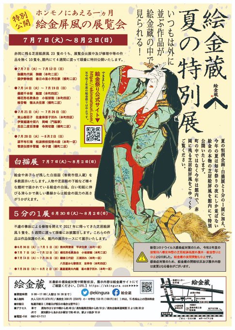 祭りの夜にしか並ばない芝居絵屏風を、今年は絵金蔵の特別展「絵金屏風の展覧会」にて約一ヵ月間に渡り展示します!祭りができないからこその特別展、館内でじっくりご覧くださいませ。(⇒)