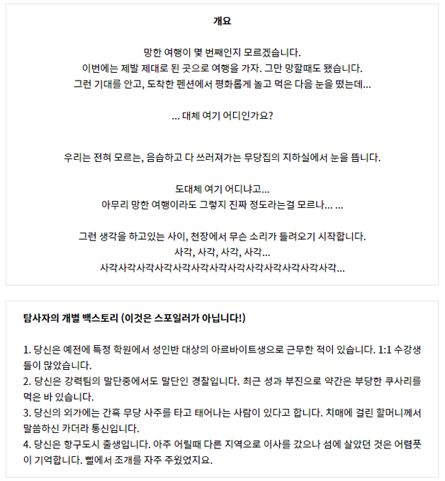 탐사자들에게 개별 백스토리가 존재하는 한국형 공포물 호러 시나리오입니다.