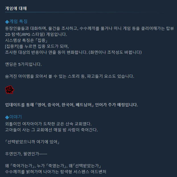적인지 아군인지 불분명한 캐릭터들을 만나며 수수께끼를 파헤치는 탐색형 서스펜스 어드벤처라고 하네요.