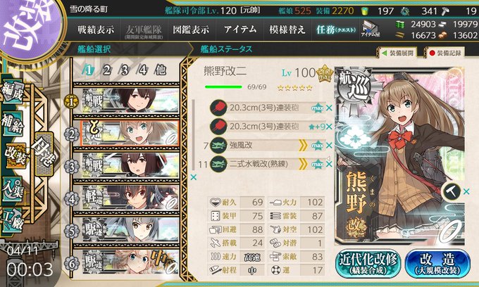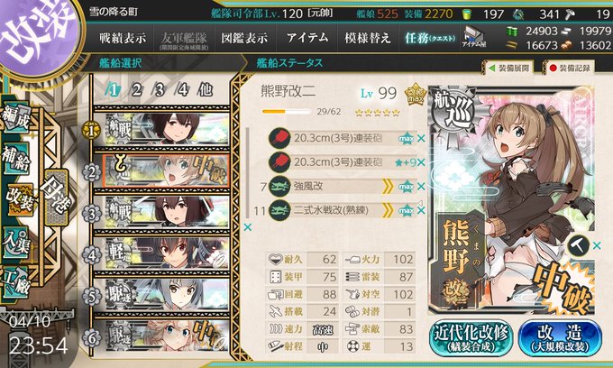 最上一強な航巡界隈ですが、戦力として割り切っている最上とは異なり、熊野はわりと本気で好きな艦娘ゆえ育てています(航巡で二番目)。