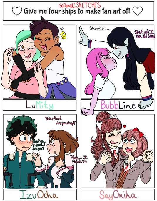 yk that feeling when you hate a piece but you’ve been working on it for hours so you feel obligated to finish and upload it? yeah💔 anyway here are the four ships :D 3/4 are sapphic POG