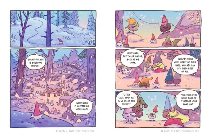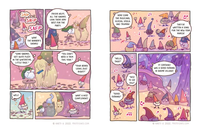 Tage wanders through a sparkling winter world, meeting some some friendly faces on his way to help a forgetful wizard make some NEW YEAR MAGIC ✨❄✨🧵(2/5)