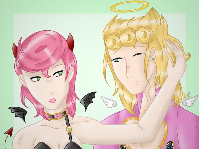 I had an idea for a long time to draw this pair as "an angel and a demon". Considering that Giorno is the son of God (Dio) and Trish is the daughter of Diavolo.