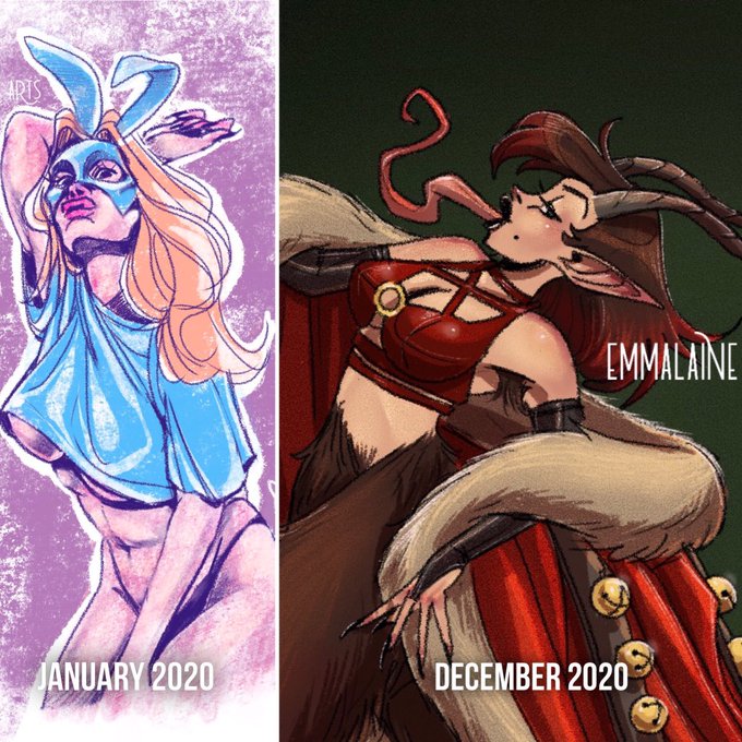 ❤️💜Progress! Didn’t think I changed much over the year artistically, but side-by-side, I think I’m far more sure of myself when drawing.