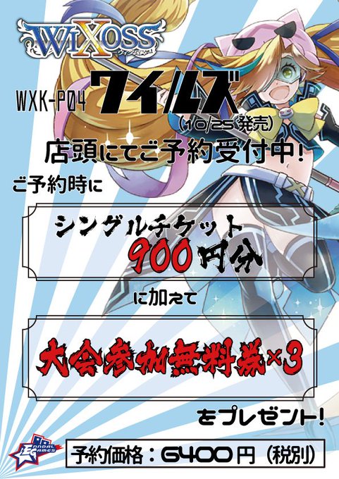 今回はご予約いただいた方に、その日から使えるシングルチケット『900円分』に加えて、WIXOSS大会の参加無料券を3枚プレゼントしております!!