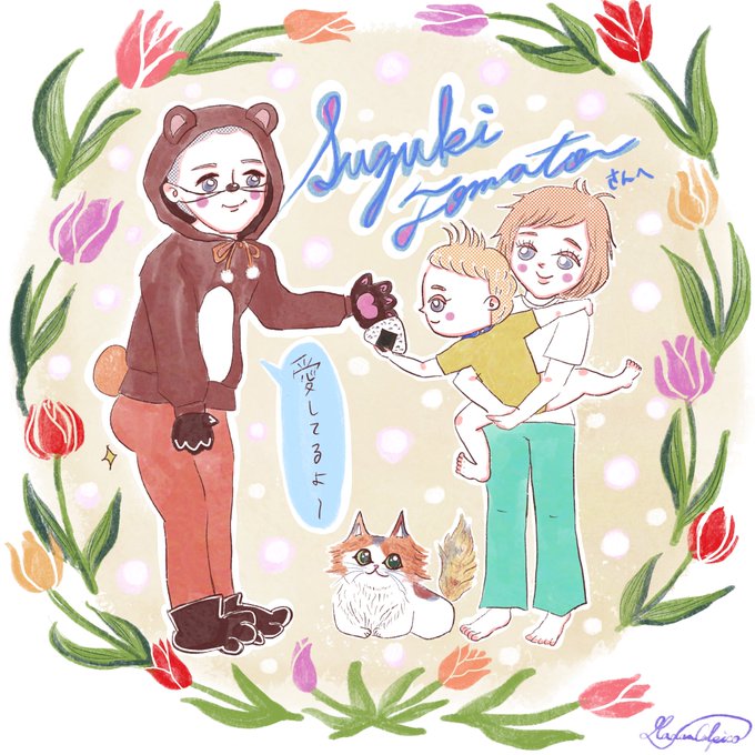 インスタのフォロワー感謝企画その④。おにぎり好きな息子さんなのでイラストに入れたけど今日まで「おにぎりアクション」という寄付のイベントが行われていたので良かった❣️ #OnigiriAction #イラストオーダー #ファミリーイラスト #Adobeブラシ #procreate #花のある暮らし #ファミリーイラスト