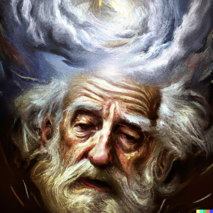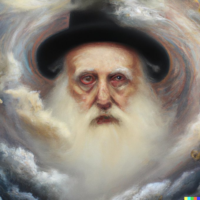 @SeforimA Levitating old man with white beard. Old mans eyes rolled back into his head. Old man surrounded by swirling storm clouds, and Hebrew letters flowing forth from his forehead upwards towards a light source in the sky. Oil painting.