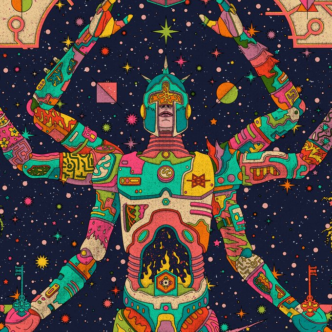I curate my art feed to be a fusion of psychedelic, spiritual, and mathematical - producing emergent themes. Here are 3 similar works I've discovered today. Think 6 arms 😛. Credit @NuwanShilpa @YigitYerka @flostitanarum