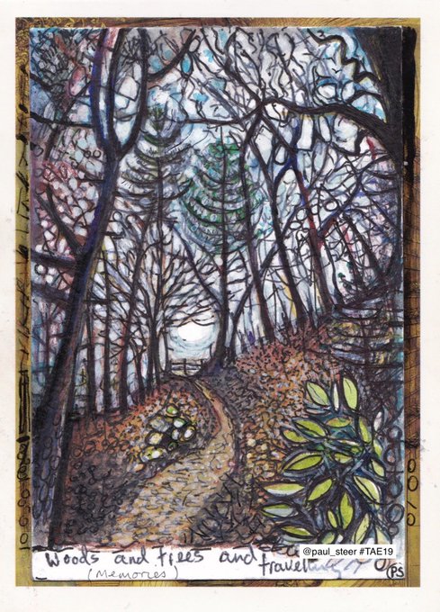 Woods and Trees and Travel by #TAE19 artist @paul_steer I could lose myself in those woods. Thank you so much for sending in your #postcardart for #twitterartexhibit supporting @artinhealthcare. The colours and complex shapes look amazing on a big screen. #ArtinArtsBlog