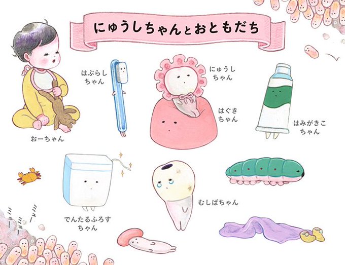絵本『にゅうしちゃん』岩崎書店さんより4/21発売予定。画像のミューミュー言っているのはミュータンスちゃんです。詳細→ https://t.co/kZPY3vJiQb #にゅうしちゃん #乳歯ちゃん #虫歯ちゃん