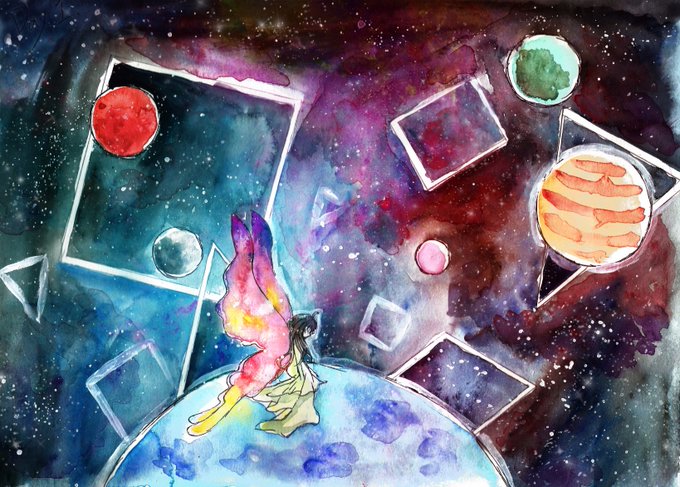 畫個七日繪 第一天,蝴蝶、行星、幾何。 #チョウを #わくせい #いくら #いくばく #水彩 #すいさい #しょうじょ #うちゅう