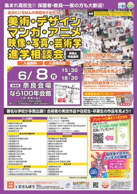 6/8(月)奈良市なら100年会館にて、高校生などを対象とした美術・デザイン・マンガ・アニメ・映像・写真 進学相談会&作品展示を開催!参加校などの詳細は画像を参照!他の進学相談会はこちらからhttp://t.co/lbk2oHJfTY