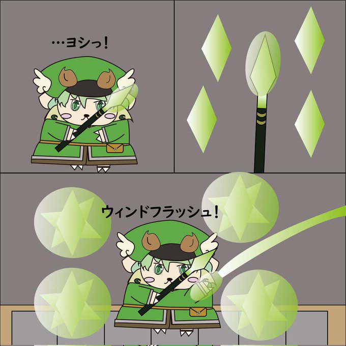 ハヤテちゃんの技ウィンドフラッシュは槍に力を貯めてコアを作り出しもう片方の手で光の道を作り出しそこにある物体や敵を作ったコアが自動攻撃するホーミングの技です❗( *´艸`)