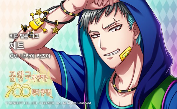[왕자소개] 제트(CV : 나카이 카즈야) - 영화의 나라 보디블의 왕자. 뒤에서 액션을 보조하는 뛰어난 스턴트맨이다. 스턴트에 큰 자부심을 갖고 있으며 액션 배우 일가에서 태어났지만 연기에는 별로 관심이 없다. 비튼 필름 파크에는 그가 스턴트를 맡은 영화의 어트랙션이 있다. #꿈왕국