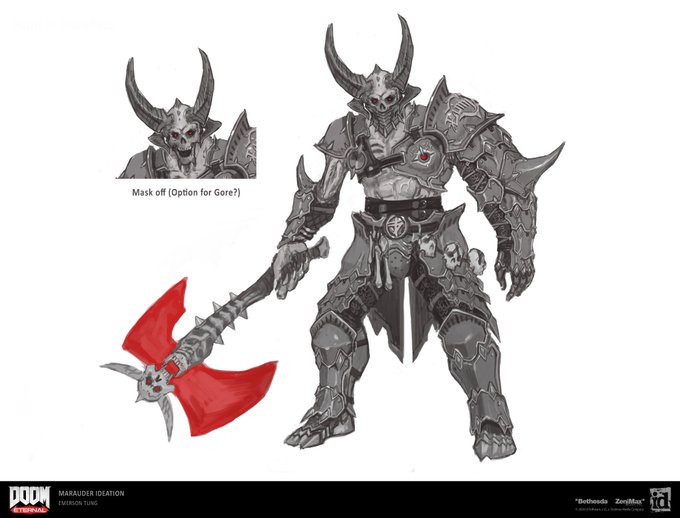 When I started using gladiators as inspiration we started heading down a direction that Hugo really liked, and it's what led to the final look of the Marauder. #doom #doometernal #conceptart #characterdesign #artistsontwitter