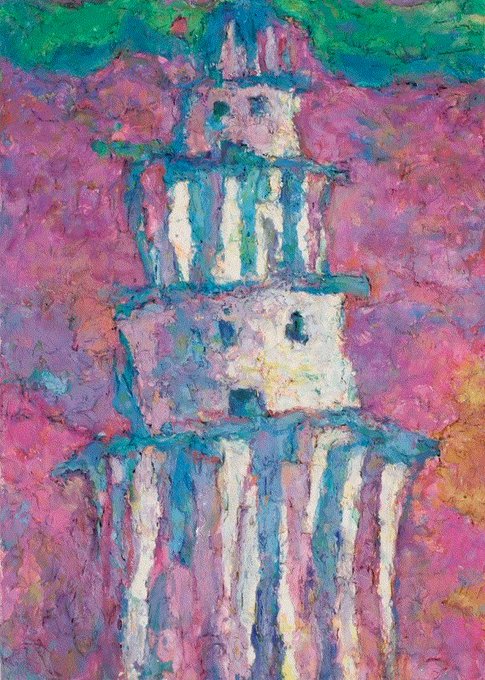 [SKY-SCRAPER(Chirico`s tower)] : 2017年の作品。キリコの絵に描かれている塔が、もし現在も建ち続けていたらどういう状態になっているか想像して描いたシリーズ。 #art #ContemporaryArt #contemporarypainting #skyscraper