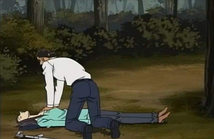 The victim was found hanging. Police gave her CPR—mouth-to-mouth and compressions—but quickly declared her dead, even though she had just made a sound moments before. The anime version (ep. 516) cut the mouth-to-mouth, showing only a few compressions.