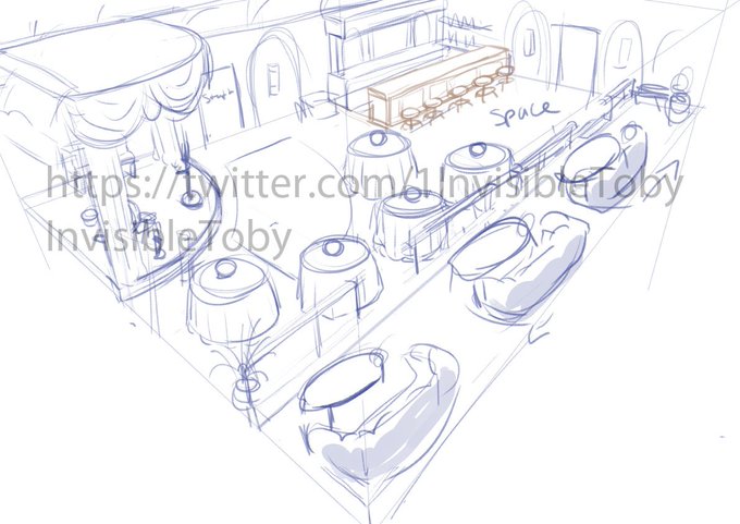 still trying to clean up the bar, trying some different perspectives. been wanting to draw that top down cube persective for awhile #1invisibletoby #design #enviromentdesign #enviroment #Jacksbar #theatrebar #speakeasy #dining #tables #stools #alcohol #mirrors #curtain #chairs